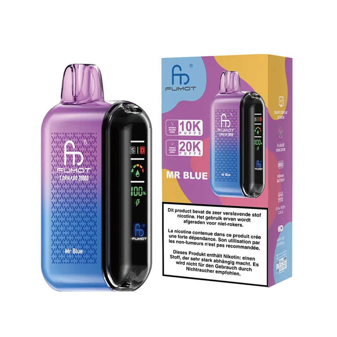 De plus, la RandM Tornado 20000 Mr. Blue est équipée d’un écran LED intelligent qui affiche en temps réel le niveau de batterie et le e-liquide restant.