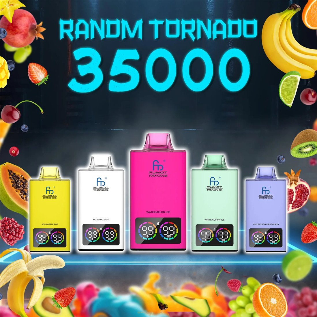 La RandM Tornado 35000 propose 38 saveurs riches et variées, réparties en trois catégories : mélange de fruits, saveurs glacées et saveurs uniques. Les mélanges de fruits sont dominés par des arômes fruités complexes, tels que « Blueberry Cherry », « Peach Mango Watermelon Ice » et « Fraise Kiwi », qui offrent une expérience sucrée intense grâce à l’association de fruits composés. La gamme glacée met l’accent sur la sensation de fraîcheur, avec notamment « Black Ice », « Blue Razz Ice » et « Cool Mint », qui conviennent aux amateurs de fraîcheur intense. La marque RandM Tornado a également lancé des combinaisons uniques et créatives, comme « Cactus Lemon Green Tea » et « Cherry Cola », qui associent des boissons ou des éléments végétaux pour une touche de fraîcheur.